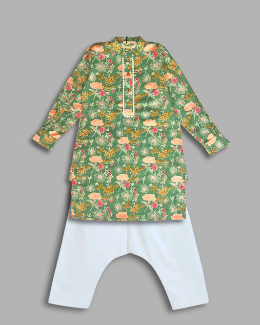 BOYS MINTY GREEN FLORAL KURTA SET WITH NEHRU JACKET