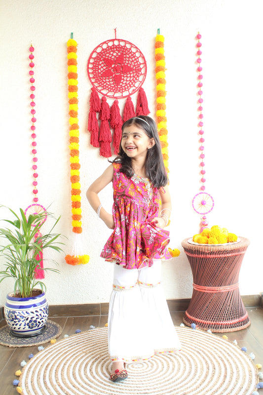 Yellow Bandhani Printed Cotton Kurti With White Sharara - Set of 2