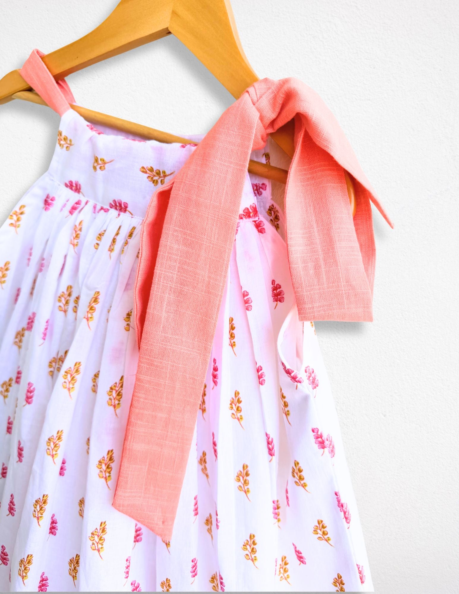 This elegant white and peach knee-length dress is designed for comfort, play, and picture-perfect moments. Crafted from soft, breathable fabric, it features a delicate pastel print and a statement bow detail that adds just the right touch of sweetness.